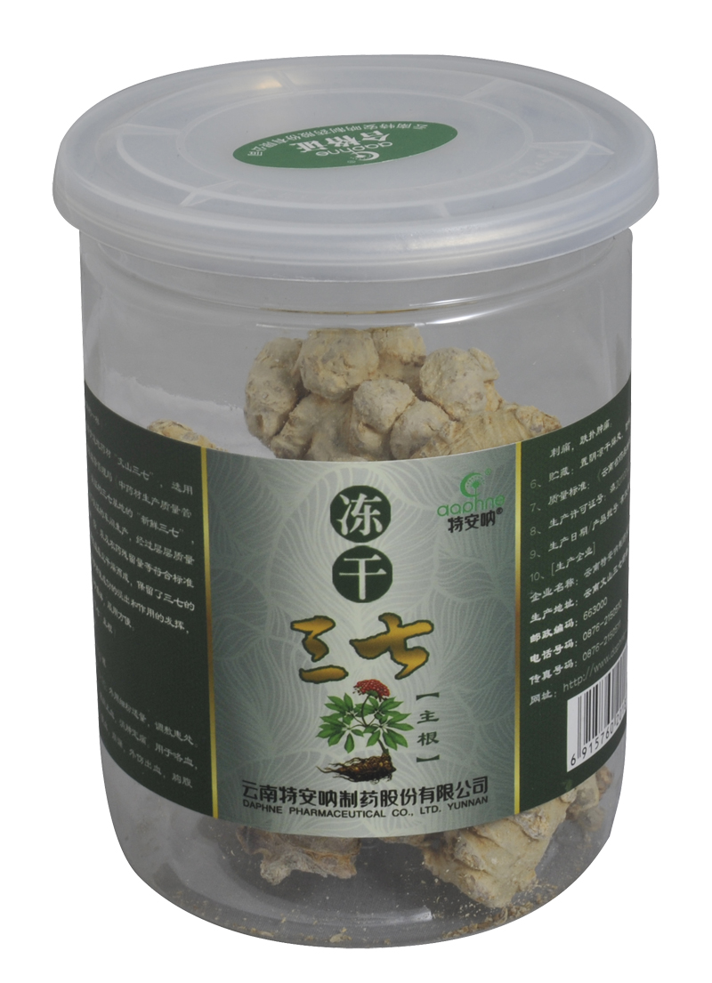 【產(chǎn)品描述】:本品原料來(lái)源于地道藥材“文山三七”,選用通過(guò)國(guó)家食品藥品監(jiān)督管理局《GAP》認(rèn)證的三七基地的優(yōu)質(zhì)三七,通過(guò)中藥飲片《GMP》認(rèn)證的車(chē)間生產(chǎn),經(jīng)過(guò)層層質(zhì)量把關(guān),重金屬砷、鉛、汞及農(nóng)藥殘留量等符合標(biāo)準(zhǔn)規(guī)定。本品采用低溫真空干燥而成,保留了三七的活性成分,有利于活性成分的浸出和作用的發(fā)揮,且組織疏松,易于磨碎,服用方便。