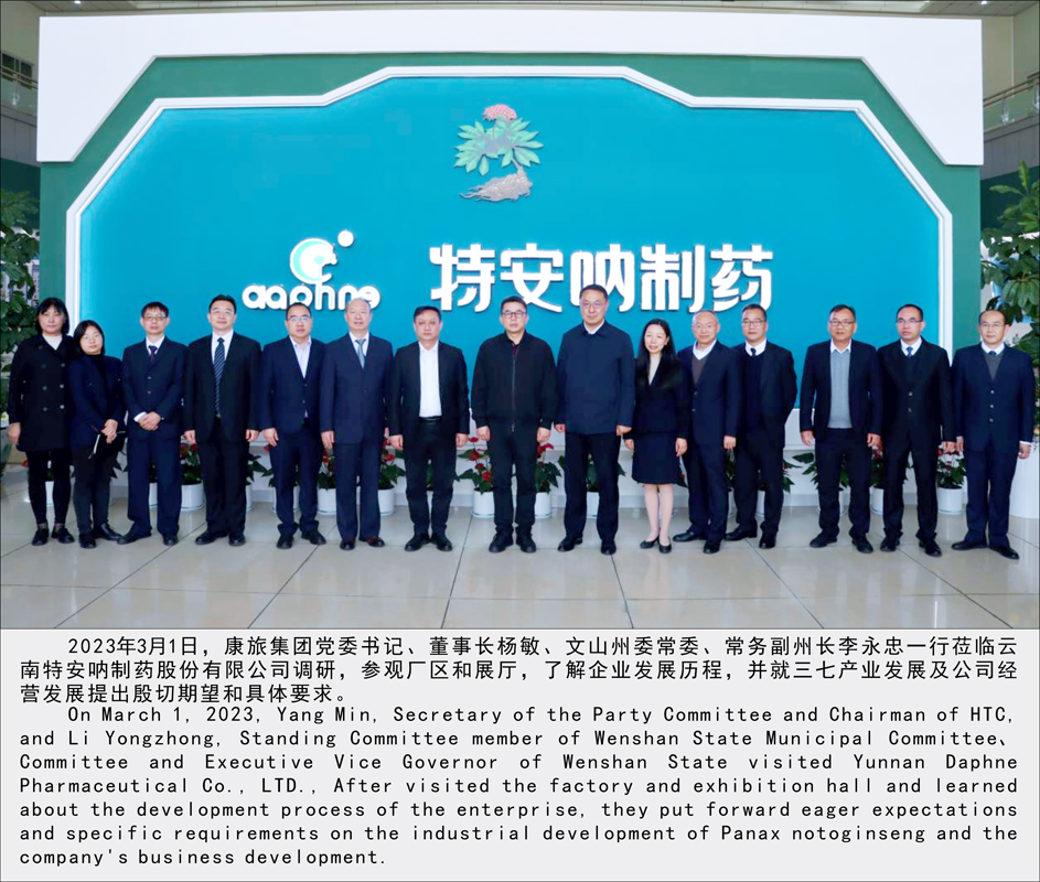 2023年3月1日,康旅集團黨委書記、董事長楊敏、文山州委常委、常務副州長李永忠一行蒞臨云了解企業(yè)發(fā)展歷程,并就三七產業(yè)發(fā)展及公司經南特安吶制藥股份有限公司調研,參觀廠區(qū)和展廳, 營發(fā)展提出殷切期望和具體要求。